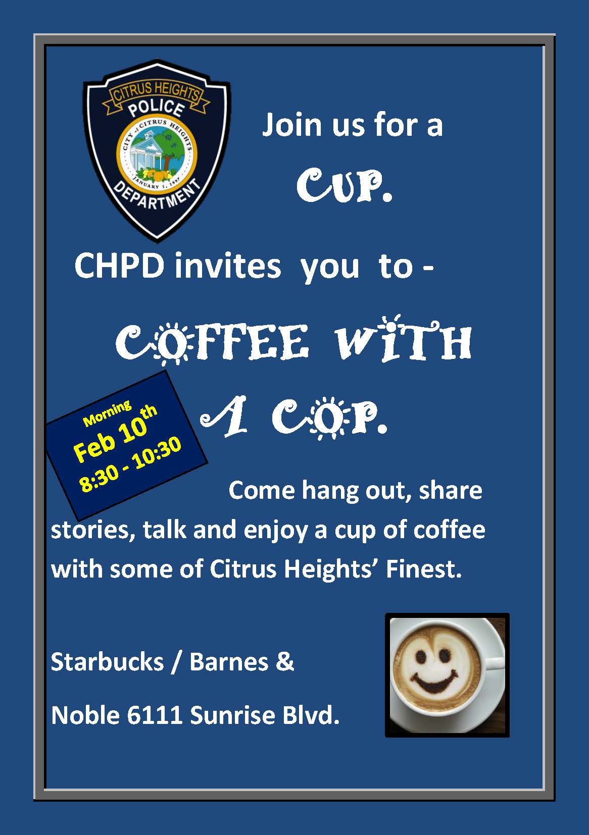 Coffee with a Cop, Feb. 10– The Citrus Heights Police Department is inviting community members to “enjoy a cup of coffee with some of Citrus Heights’ finest” at Starbucks, inside Barnes & Noble at 6111 Sunrise Blvd. An invite flier on CHPD’s Twitter account says attendees will have a chance to “hang out,” share stories, and talk with officers. The event is scheduled from 8:30 a.m. to 10:30 a.m. (See flier)
