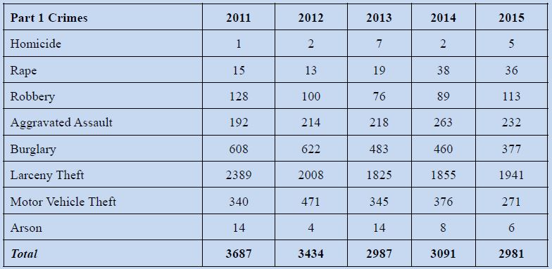 In comparing 2011 crime to 2015, motor vehicle theft dropped from 340 down to 271 and burglaries were almost slashed in half, but rape doubled from 15 up to 36 cases, and homicides rose from just one in 2011, to five last year.